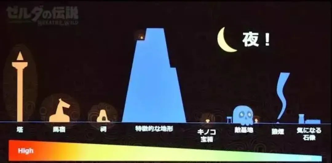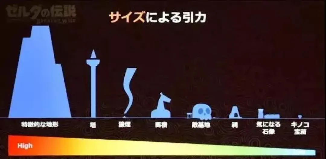 相比于直接标注/引路的强引导,弱引导更多地是采用一种润物细无声的方式,比如视觉效果上的暗示,比如自然元素的引导。《塞尔达传说:荒野之息》毋庸置疑是弱引导方面的大师,它借由引力法则和三角形法则创造出了一个充满无形引导的海拉鲁大陆。引力法则就是所谓的运用POI(point of interest,兴趣点)来吸引玩家,这些POI依托不同的形象特征与信号颜色来表现出不同程度的吸引力。