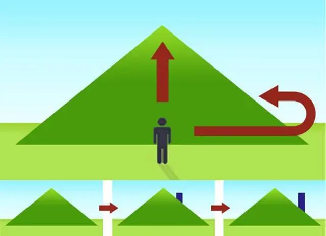 这就要提到旷野之息的第二条设计法则了:三角形法则。旷野之息将地形起伏和自然物基本都设计成了三角形。这些三角形将上文所述的POI划分开来,同时阻挡着玩家的视线。大三角形如高山和山脉,本身作为一个极强的POI吸引着玩家前去,同时遮挡了山后的POI。中三角形如小山丘和各种建筑设施等,自然地遮挡着一些POI,让这些POI呈现出一种若隐若现的效果。小三角形如地形起伏和石头等,则在局部地区把控着玩家探索的节奏。