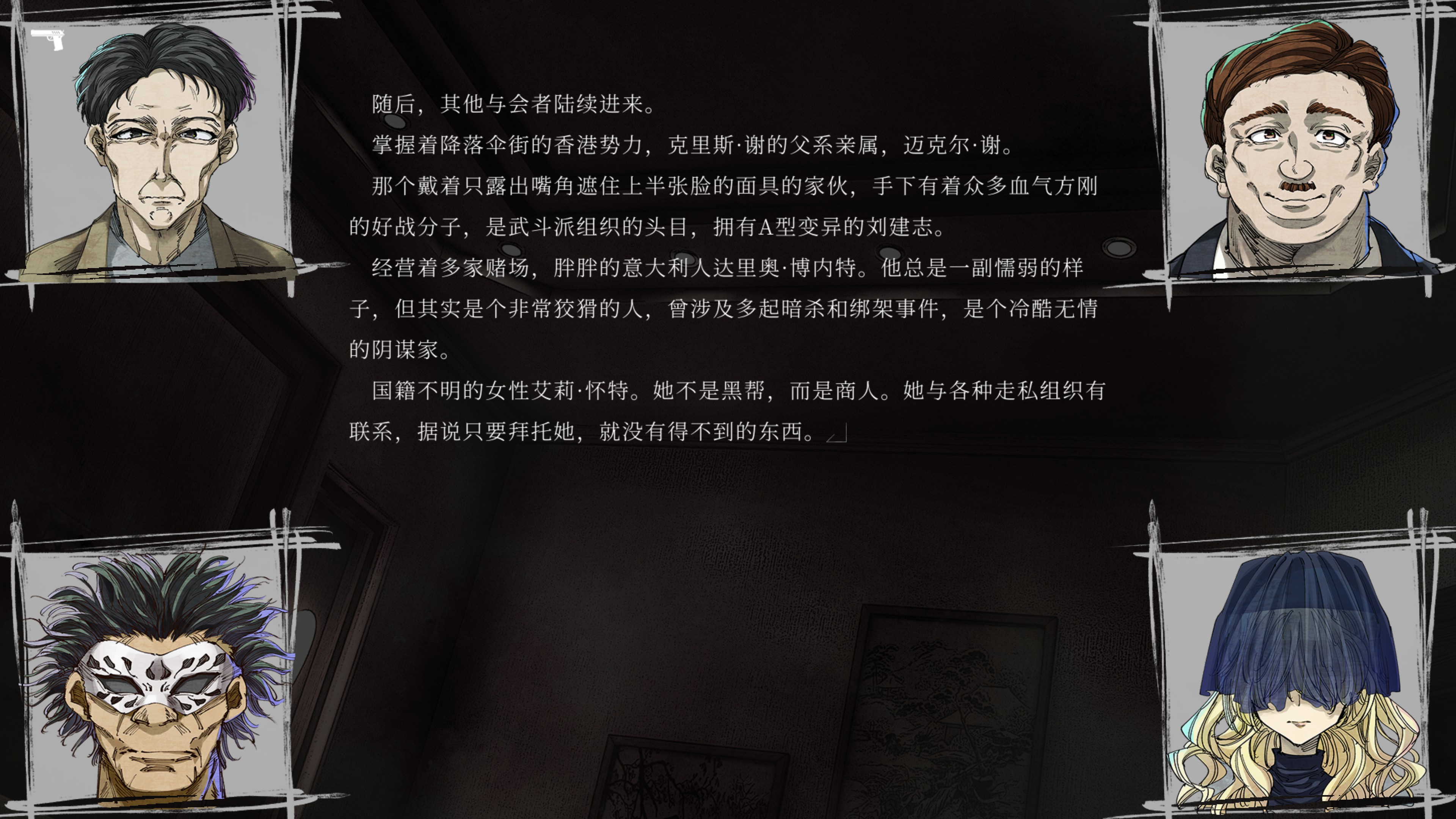 这座混乱的城市在极富个人魅力的前任黑帮首领中自洽地产生了相应的秩序,但其将身死,很快城市就将重归混乱。可以看出,这是一个极佳的舞台,诸多角色在此般混乱中悉数登场,有人带着自己的意愿行动,有人则在寻找自己的使命。这些个人的剧情碎片在前文所述的叙事结构中串联交织起来,构成了本作的剧情。