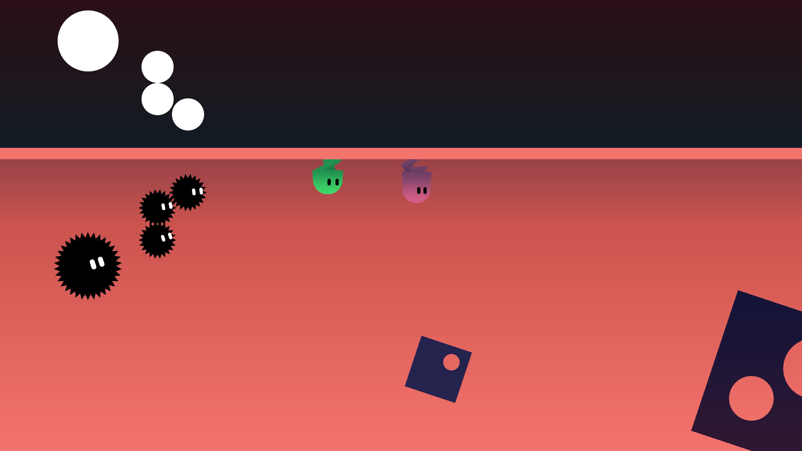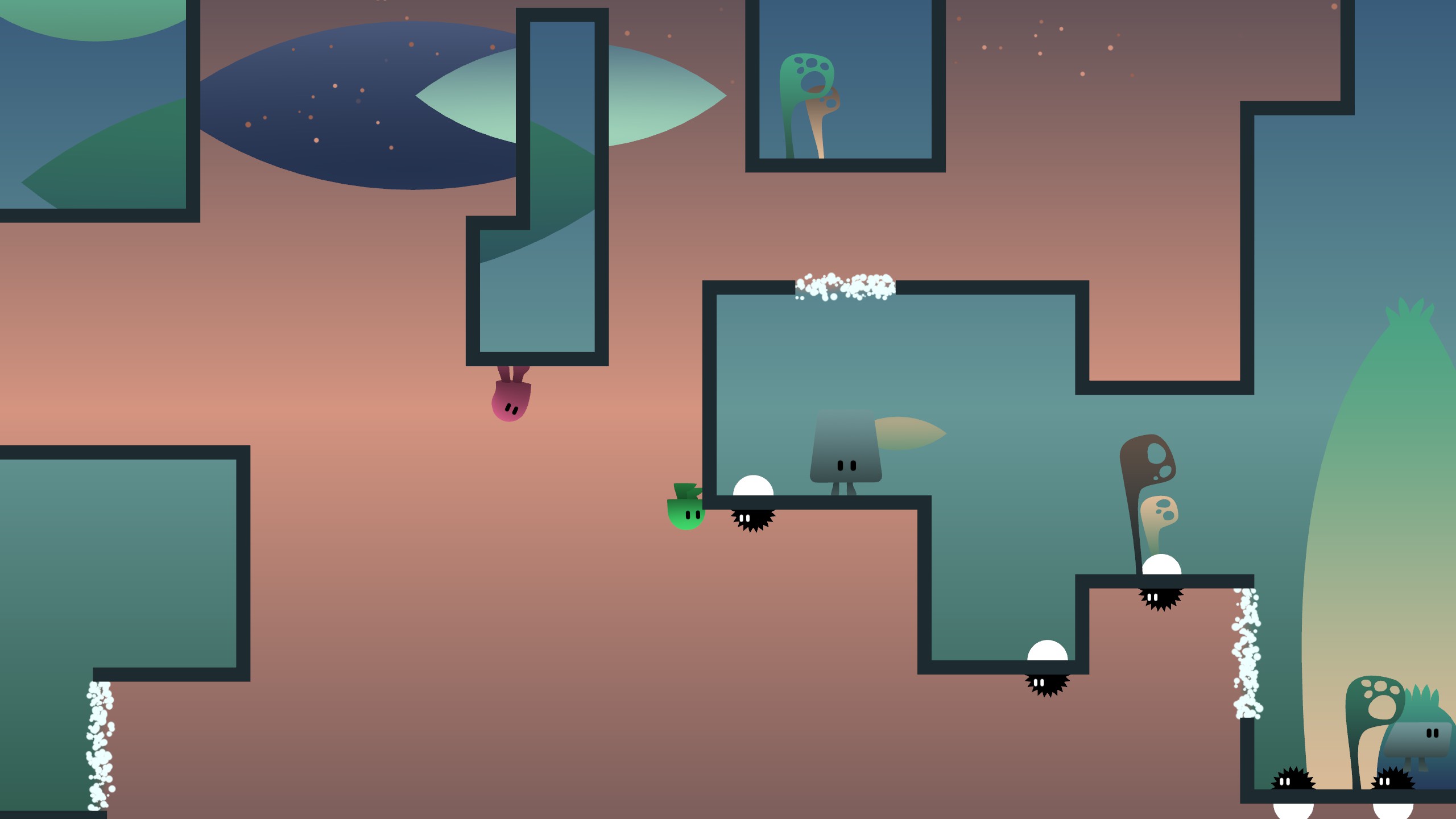 本作是一款以平台跳跃为主要形式的双人解谜游戏。其亮点在于围绕重力机制(动能势能转换)和对称世界(上下对称)设计的谜题。