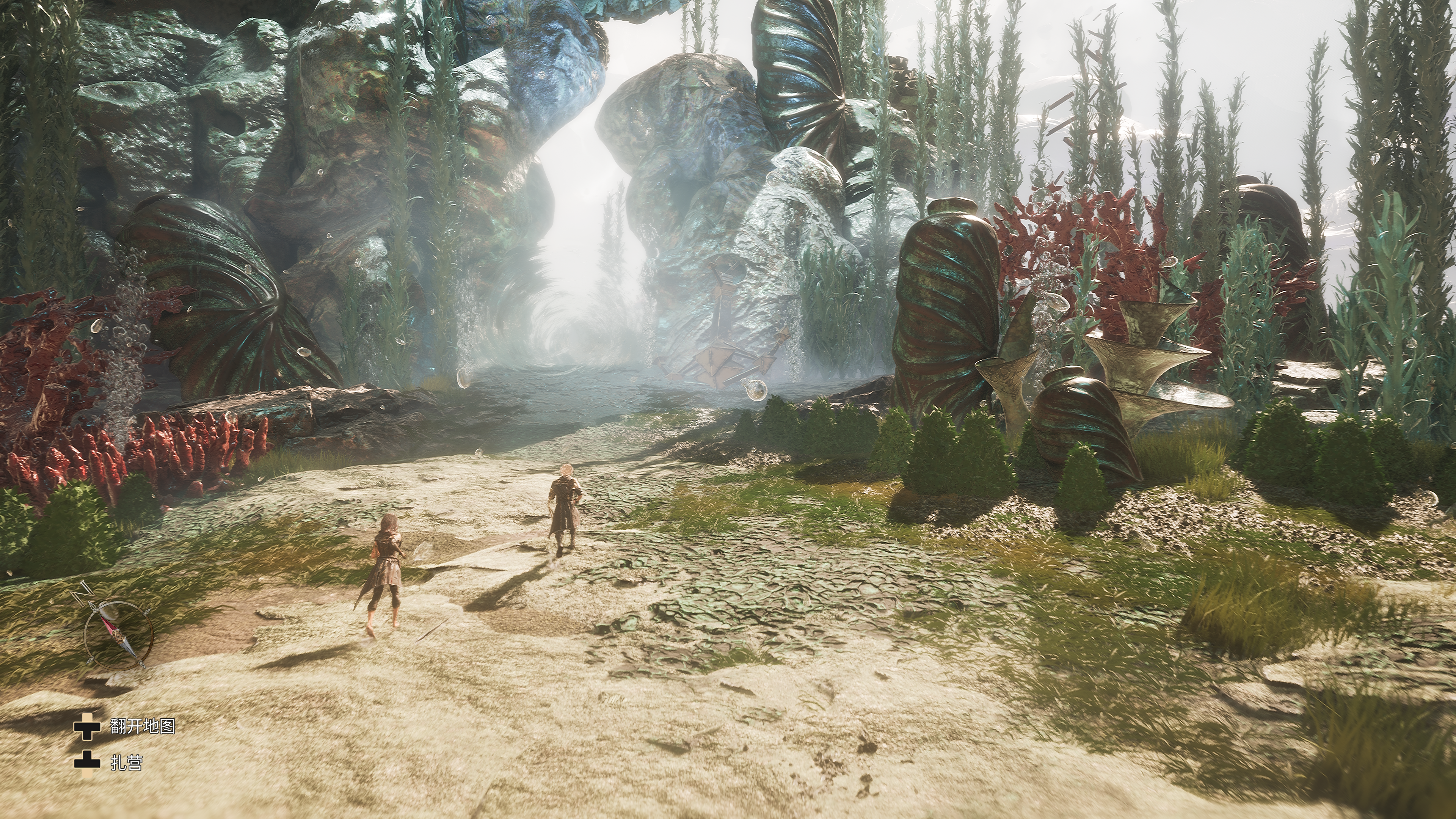 场景美术大概是本作美术风格的集中体现之处,本作场景风格丰富多变,从原野到海底,从雪山到宫殿……但无论怎样变化,其共通之处是高度自然统一的视觉风格(不过这对关卡引导带来了不小的困扰,当然这是后话)——鲜明的色彩,高饱和的光照,随处可见的体积雾带来了梦幻般的场景质感。