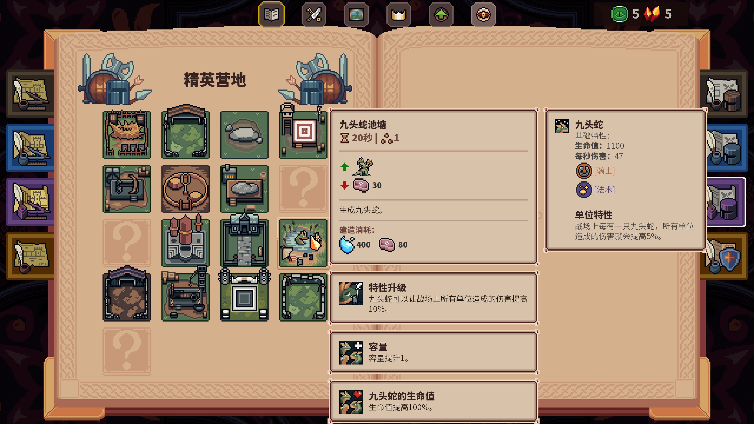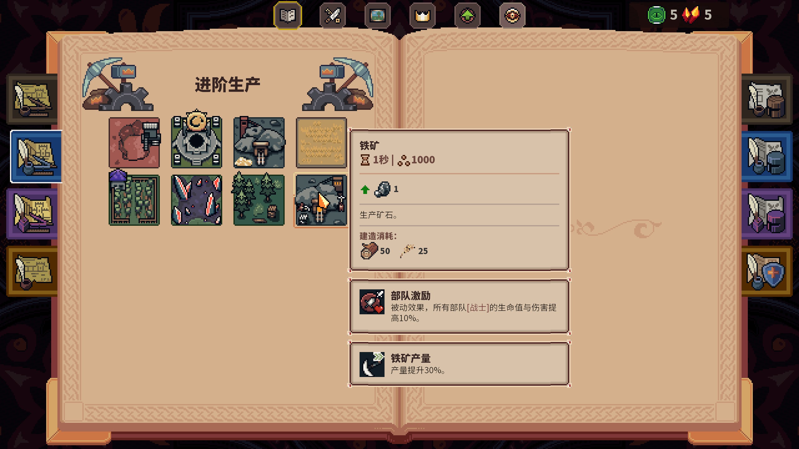 - 即时战略:存在时间流逝系统。玩家需要实时生产兵力来对抗按波次来袭的敌人(和boss)。